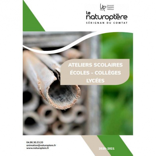 L’UPV-Naturoptère dispose d’un catalogue riche de plus de 40 animations adaptées aux programmes scolaires de chaque cycle. Les thématiques abordées dans ces ateliers sont diverses mais toujours en lien avec l’environnement et le développement durable. Le site du Naturoptère offre un cadre privilégié pour réaliser ces animations, grâce à son bâtiment éco-construit, ces différents jardins pédagogiques et ses expositions diverses.