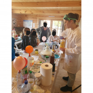 Manipulations et démonstrations d'expériences de physique/chimie rigolotes (découverte des couleurs avec la lampe à lave artisanale, le dentifrice de dinosaure, gonfler un ballon sans souffler dedans, fabriquer un volcan, etc.).