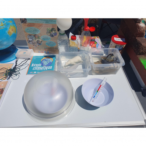 Changement climatique (1h30 - dès 6 ans) : explications sur le climat/météo, expériences scientifiques sur la fonte des glaces, l'effet de serre et le dioxyde de carbone.