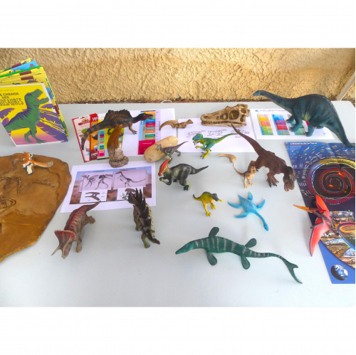 Plusieurs jeux et activités sur les dinosaures et la paléontologie : fouilles de véritables fossiles dans des bacs de sable, fabrication de moulage de fossiles en plâtre (ammonite, trilobite, dent ou griffe de dinosaure, oursin, etc.), activité de reconstitution de la frise chronologique de l'histoire de la vie sur Terre, jeu "Dino or not dino", jeu d'association squelette - figurine de dinosaure, jeu des étiquettes (remettre les étiquettes à côté du bon fossile), puzzles et coloriages.