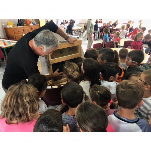 Une ruche sous verre avec une colonie (reine, ouvrières)